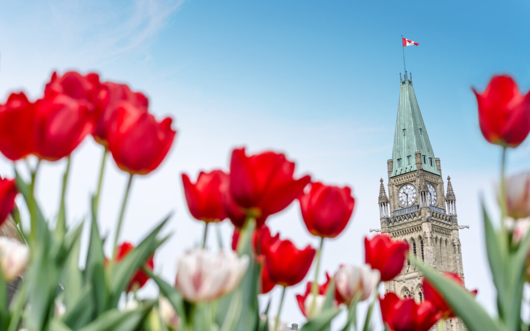 Peace Tower of Parliament building at Ottawa during Ottawa Tulip festival.